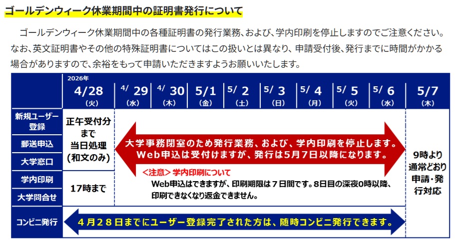 令和8年4月29日(水)~5月6日(水)の期間は、事務室の休業に伴い、各種証明書の発行業務及び証明書新規ユーザー登録業務を行いませんのでご注意ください。
